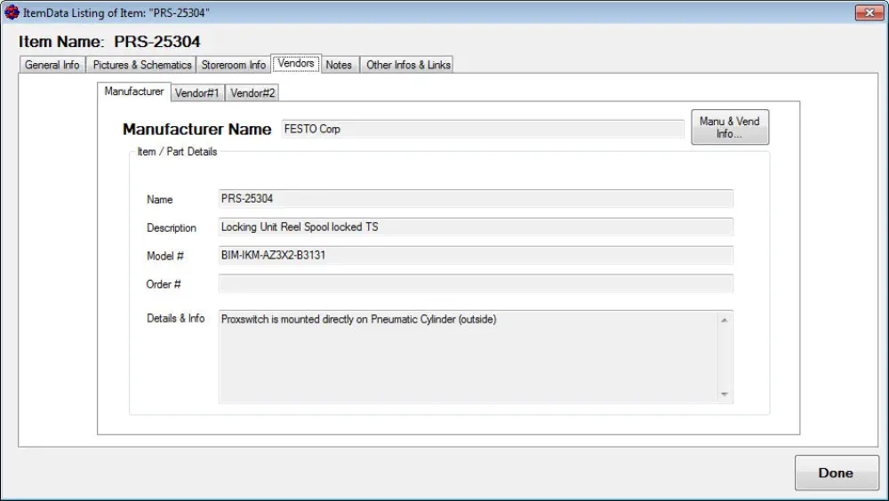 vendor order info, storeroom spare part info and of course keep a logbook with your entries every time that